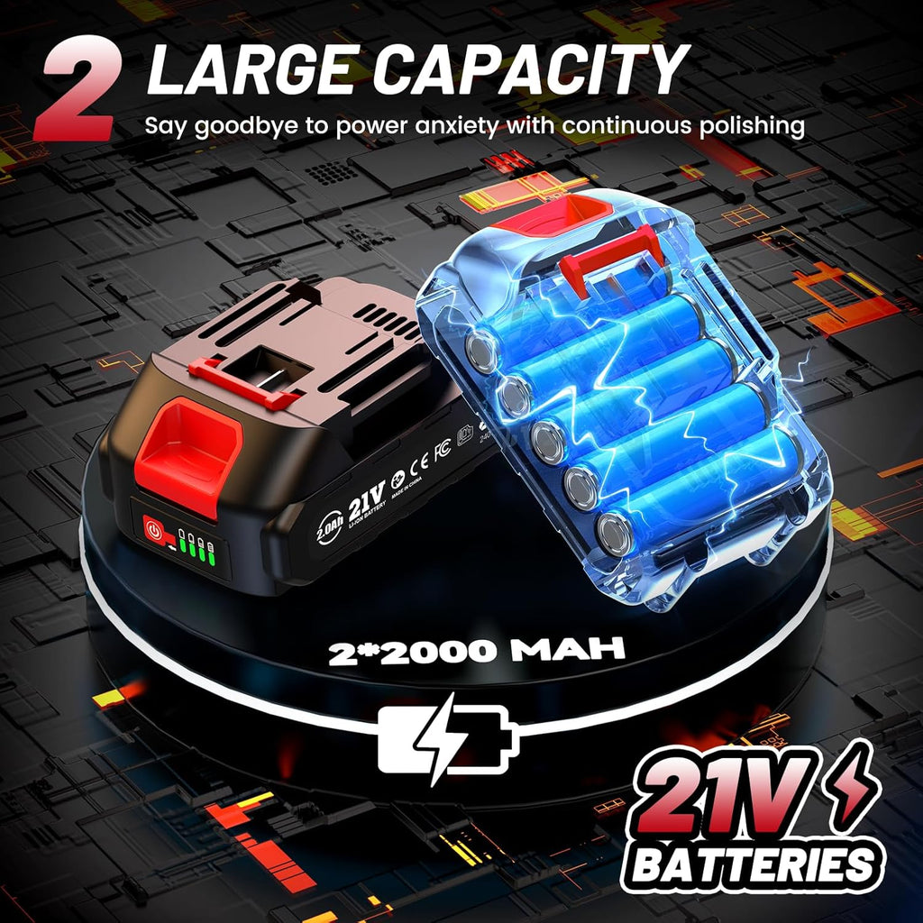• Large Capacity Battery: This polishing machine is equipped with two 21 V 2.0 Ah batteries. And equipped with a fast charger. Use two batteries alternately, no need to worry about running out of battery power, say no to battery anxiety